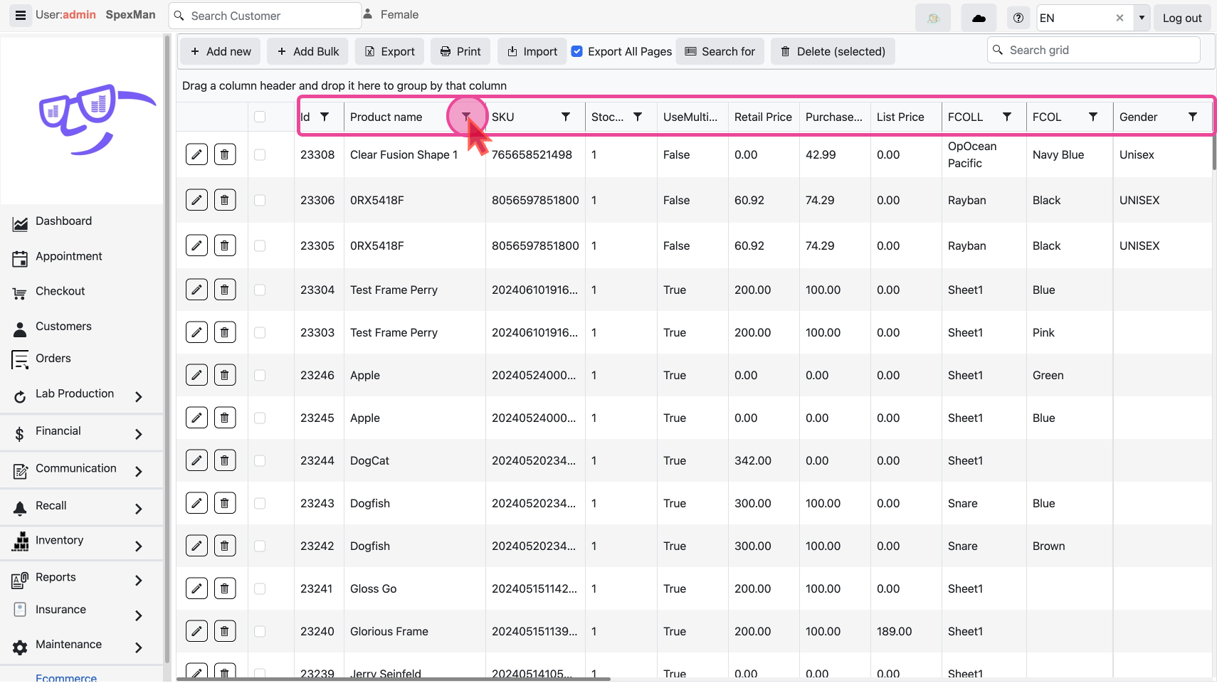 - If a Customer requests a specific frame by Name, then click the Filter Icon against the Product Name column.