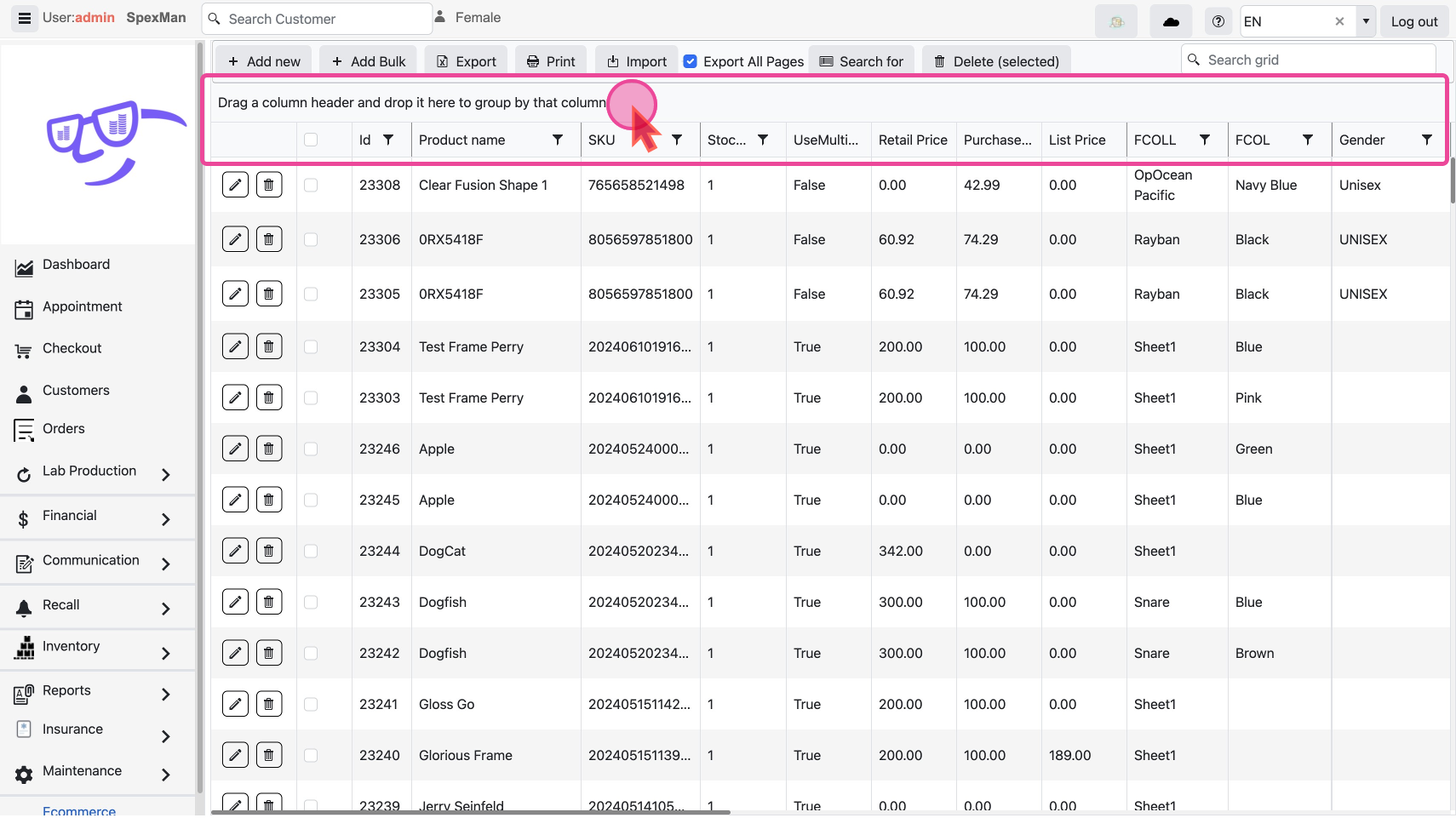 - To see frames sorted by Name, Click the Product Name column once to Sort in